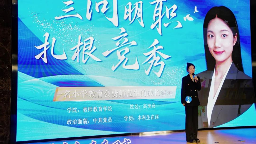 决赛现场,高琬宸以“保定市竞秀区小学教师”为职业目标,以公费师范生“下得去、教得好、留得住”的承诺为内核,回答了“竞秀区需要什么样的教师”“教师的职业底色是什么”“我该如何成为一名优秀的教师”三个问题。她通过调研访谈,发现竞秀区教育发展需要教师兼具全面发展与专长发展的能力,以应对集团化教学、课后服务等多元场景;在探寻教师职业底色时,她依托永利 “一体化育人平台”,通过小学见习与实践,勾勒出“有情怀、懂心理、善教学、能创新”的理想教师画像。为实现规划落地,她系统制定并践行了分阶段提升计划:研读教育政策,强化政治素养与育人使命感;学习心理课程、考取相关证书,提升心理辅导能力;通过实习支教积累班级管理经验,锤炼教学技能;在公益托管中融合语文与体育舞蹈特长,设计特色课程,促进学生全面发展。其逻辑严密、充满热忱的陈述与扎实的实践成果,赢得了评委的高度认可与现场观众的掌声,展现了一名未来教师坚定的职业信念与清晰的成长路径。